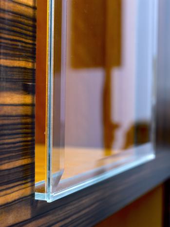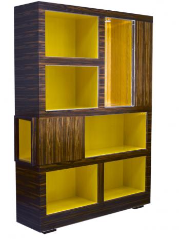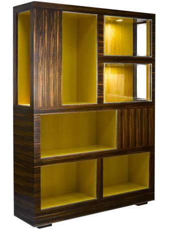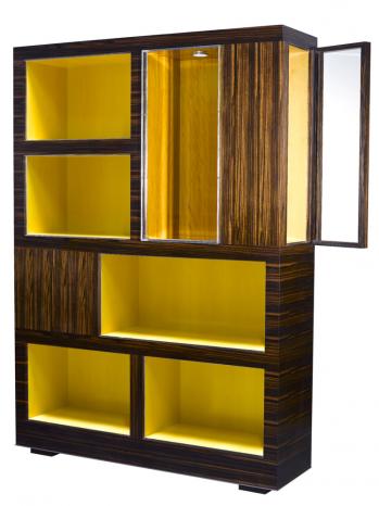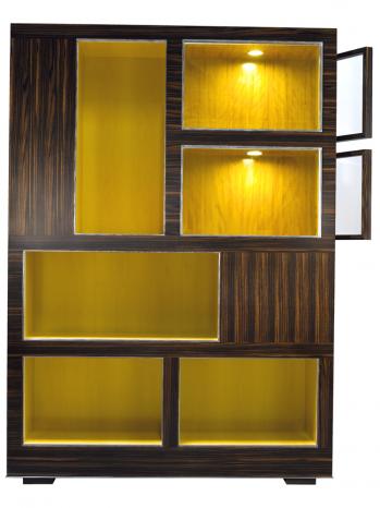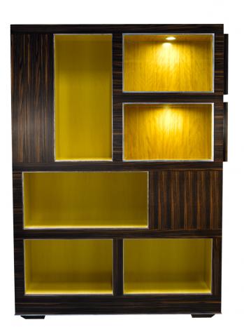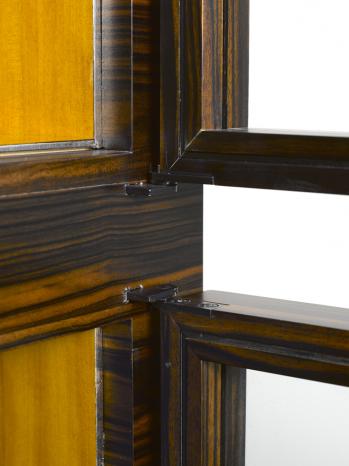 C’est avec une attention particulière sur le choix des placages d’Ebène de Macassar et de bois de citronnier, que nous avons mis en œuvre cette paire de bibliothèque-vitrine.